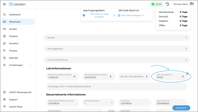 Die Diagramme auf die Personalkosten bezogen zeigen dir eine grafische Aufschlüsselung der jeweiligen Personalkosten auf. Als Grundlage wird hier der bei den jeweiligen Mitarbeitern festgelegte kalkulierte Stundenlohn genommen. Den findest du im Mitarbeiterbereich unter Mitarbeiterdaten > Lohnbuchhaltung.