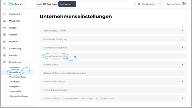 Wenn du unter dem Einstellungsrädchen auf "Unternehmen" (1.) klickst, kannst du verschiedene Einstellungen vornehmen. Klappe schließlich den Reiter "Tätigkeitskonfiguration" aus.