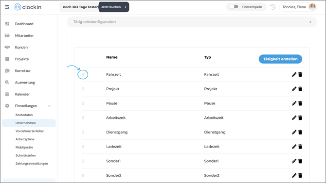 Mit den sechs Punkten (siehe Markierung in dem Screenshot) kannst du die Reihenfolge der Tätigkeiten nun individuell festlegen. Halte dazu das Symbol gedrückt und verschiebe die Tätigkeiten, indem du die Zeile nach oben bzw. unten ziehst.