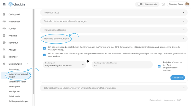 Außerdem haben wir hier die Unterkategorie "GPS-Tracking" ergänzt. Hier kannst du die GPS Einstellungen spezifisch für deine Mitarbeiter festlegen. Definiere ganz einfach, zu welchen Zeitpunkten du gerne eine Benachrichtigung zu den Geo-Marken deiner Mitarbeiter erhalten möchtest. Ebenfalls kannst du das GPS Tracking hier für einzelne Mitarbeiter deaktivieren.
