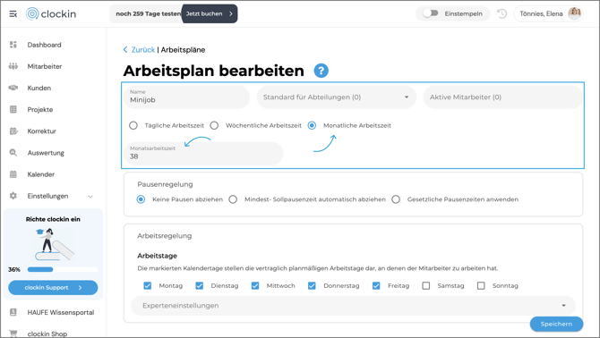 Wähle den Arbeitsplan schließlich dem entsprechenden Mitarbeiter zu. Außerdem kannst du den Arbeitsplan entsprechend benennen. Vergiss nicht, die Änderungen zu speichern.