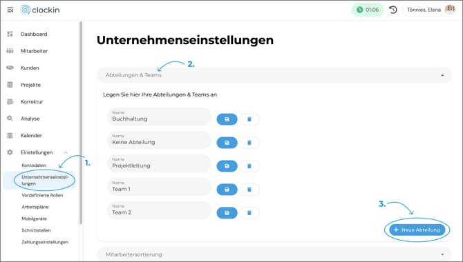 Um ein neues Team beziehungsweise eine neue Abteilung in clockin anzulegen, gehe wie folgt vor: