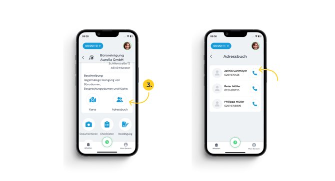 - Oder: Den Bereich „Adressbuch“, wenn mehrere Kontakte im Projekt gespeichert sind. Hier findest du eine Übersicht aller hinterlegten Ansprechpartner samt Kontaktdaten. Tippe auf das Telefonsymbol beim entsprechenden Kontakt, um direkt einen Anruf zu starten.